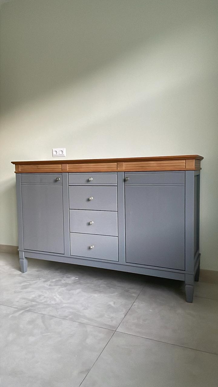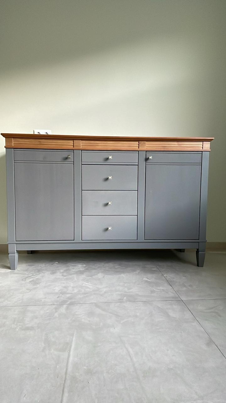 Комод оснащен двумя распашными дверками с полками внутри и четырьмя ящиками. Фурнитура на дверях и ящиках с доводчиками. Высокие ножки обеспечивают оптимальный доступ при уборке.